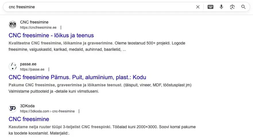 Tamar toob näitena ka puidutoodetega ettevõtte OnWoods OÜ, kelle põhileht on onwoods.ee, kuid kes kasutab lisaks teenusepõhist domeeni cncfreesimine.ee, mis on Google’is kõrgel positsioonil: