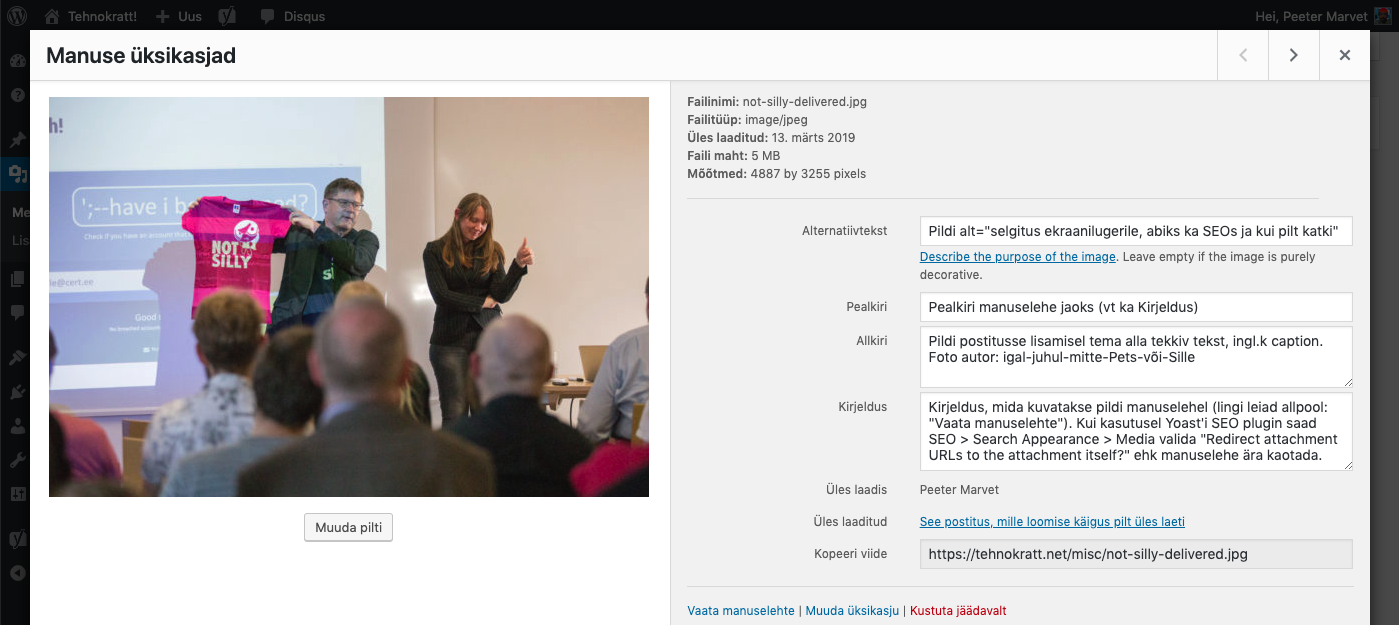 Alustame vahest kõige olulisemast – Alternatiivtekst kirjeldab pilti ning seda näeb kui vaadata lehe HTMLi või WordPressi redaktoris sakki Tekst: