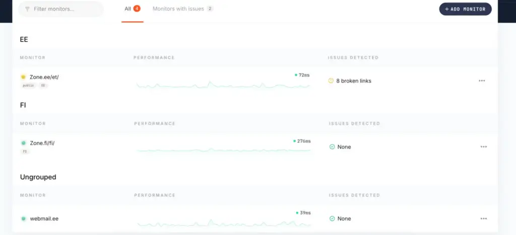 Kõik monitooringud seotakse sinu virtuaalserveriga ning kuvatakse eraldi üksustena (tiimidena), mis teeb haldamise ja ülevaate lihtsaks ka suurema hulga veebilehtede puhul.