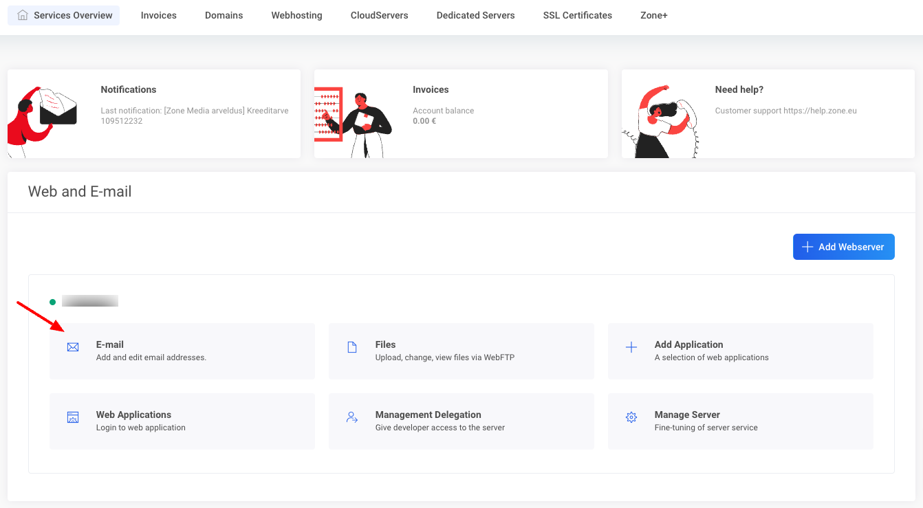 In order to configure the Catch-all email account on our website choose My Zone and log in using your ZoneID account information. On the service overview page under Web-hosting click on the shortcut E-mail.