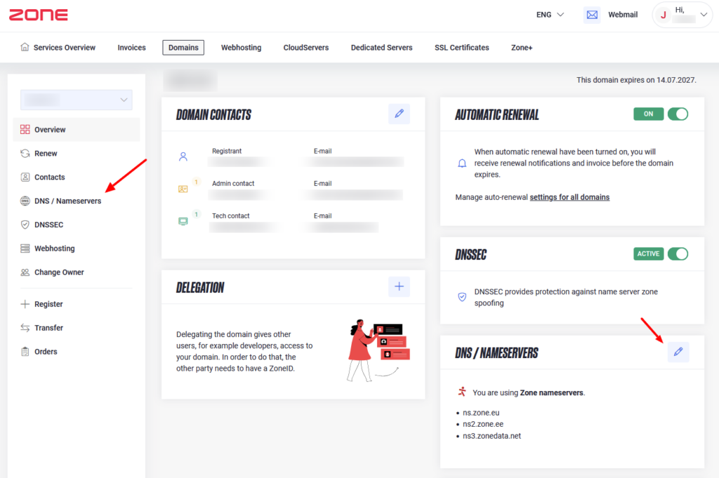 For domains in Zone registrar, you can change nameservers from “My Zone” control panel by clicking on your domain name from Services overview window