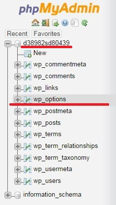 In the phpMyAdmin panel, click on the database name in the left block, then select wp_options in the opened option (instead of wp, table may also have a different prefix).