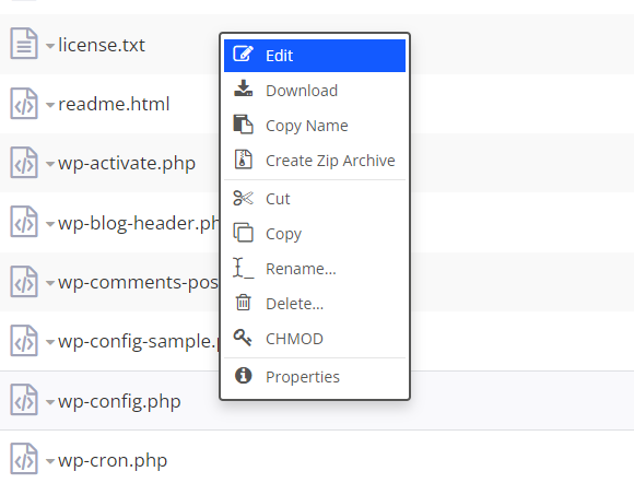 Then open the wp-config.php file (right click and Edit).