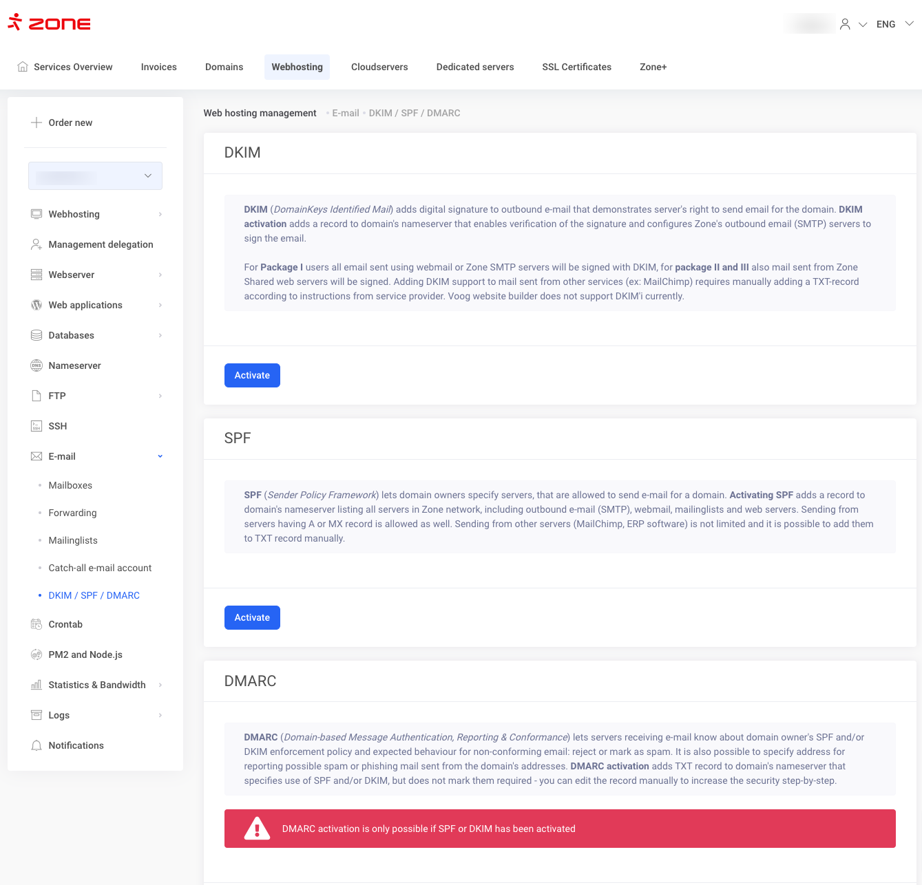 DKIM technology can be activated in the My Zone control panel, through the server management under E-mail -> DKIM / SPF / DMARC.