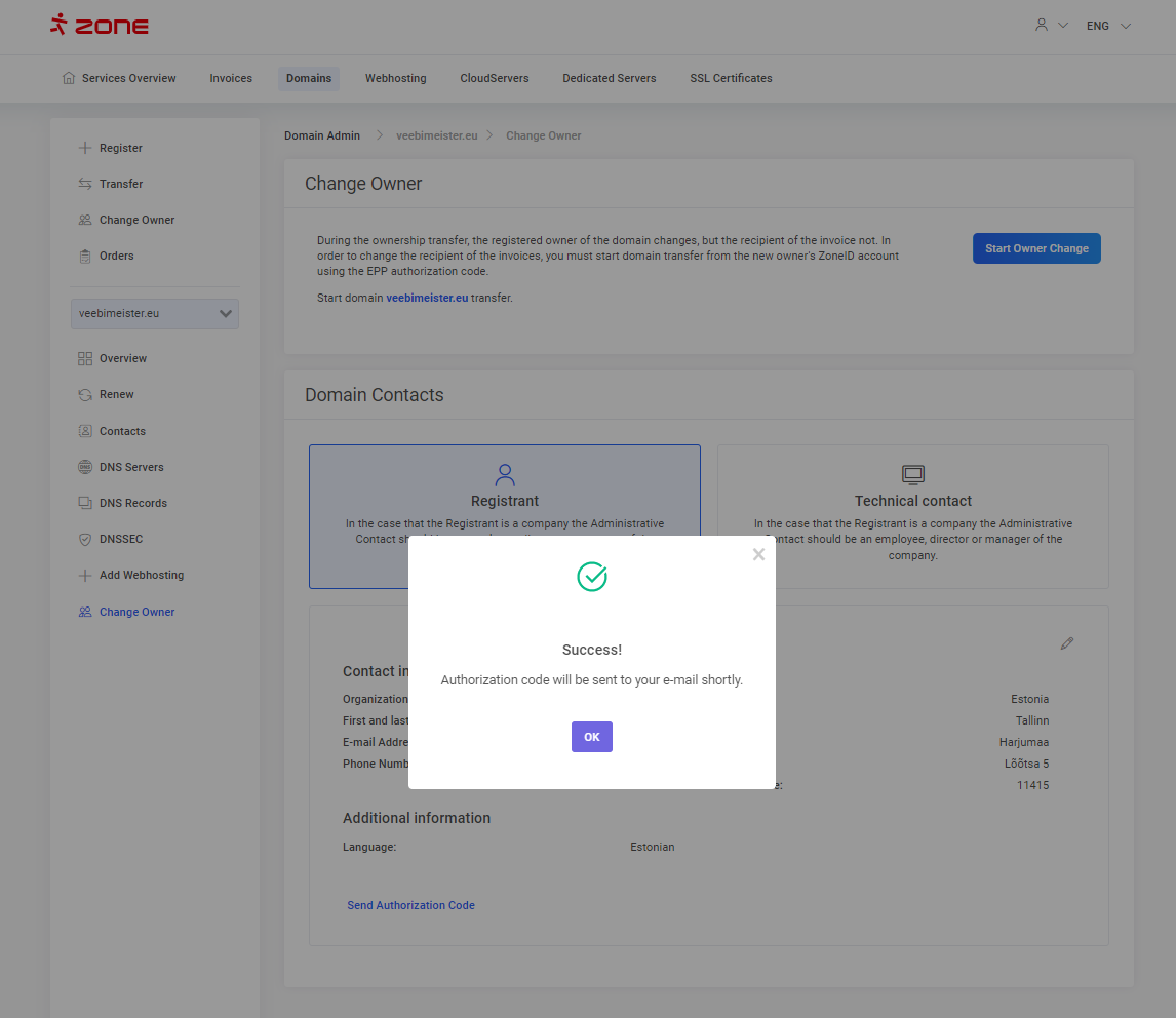 The authorization code will be sent to the domain owner’s contact email address within 10-15 minutes.