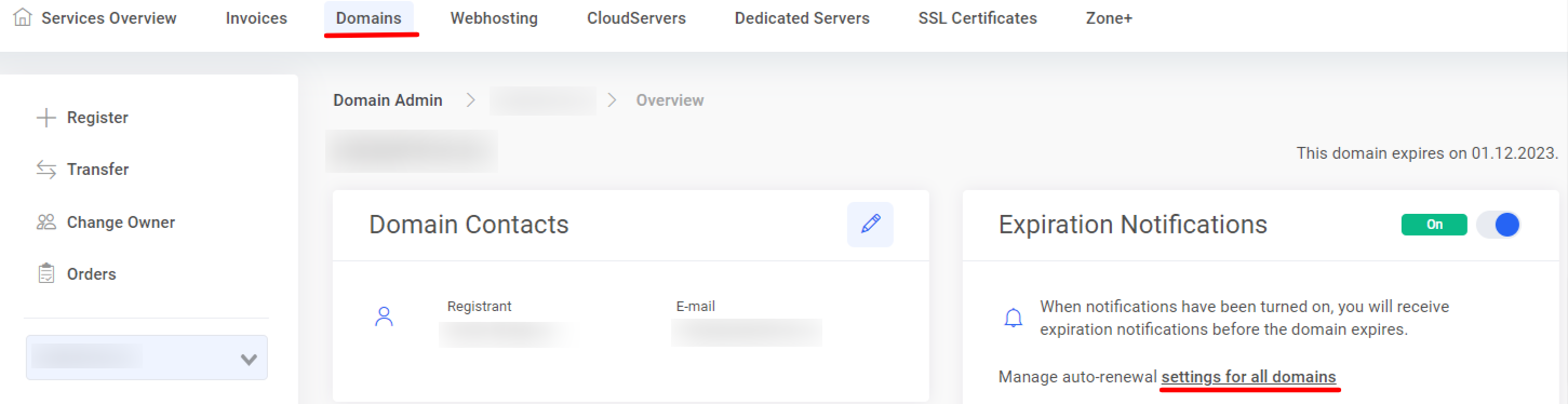 If you do not need to renew your domain, you can switch the button to Off to disable notifications about domain expiration. This means that no reminders will be sent and no renewal invoice will be issued.