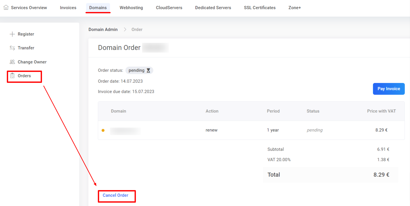 2. In the My Zone control panel, in the domain management section under Orders, you can cancel the order for domain renewal along with the invoice. In order to cancel an order, click on the order number and then Cancel order. When canceling an order, the invoice will be automatically canceled by a credit invoice.