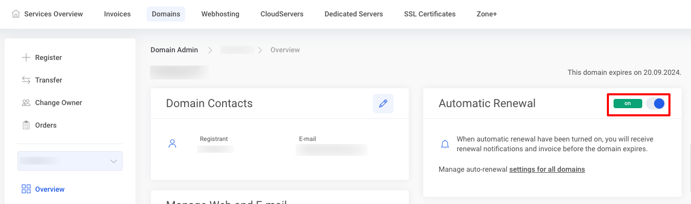 In the domain management section, first click on your domain name. The Automatic renewal  is set to ON by default, thus reminders will be sent before the domain expires reminders and an invoice will also be automatically issued for the one-year renewal.