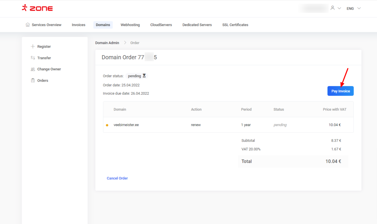 To renew the domain, simply pay the automatic renewal invoice. We recommend using a bank link for payment. When using a traditional bank transfer, please make sure to use the reference number. Also insert the domain name and the invoice number on  explanation field. The payment term on the automatic renewal bill is 10 days.