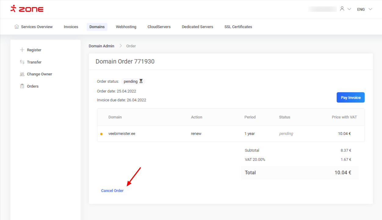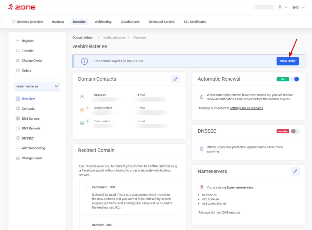 To cancel domain’s renewal order simply click on the “View order” button from “Overview” window