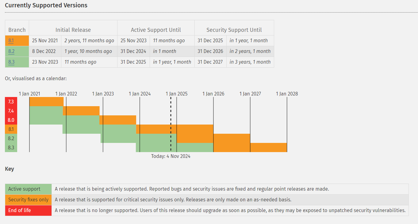 According to the PHP Project, each new version of PHP is supported for a total of two years, after which security patches are applied to the version for one year. After that, support for the official version will cease, and the patching of discovered security bugs will end.