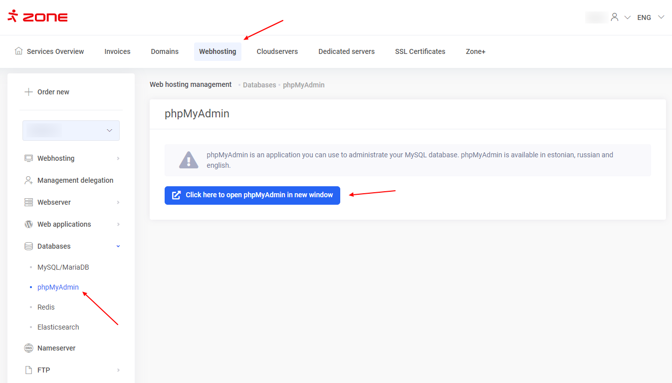 The phpMyAdmin interface for MySQL/MariaDB database management can be logged in via: https://pma.zone.ee