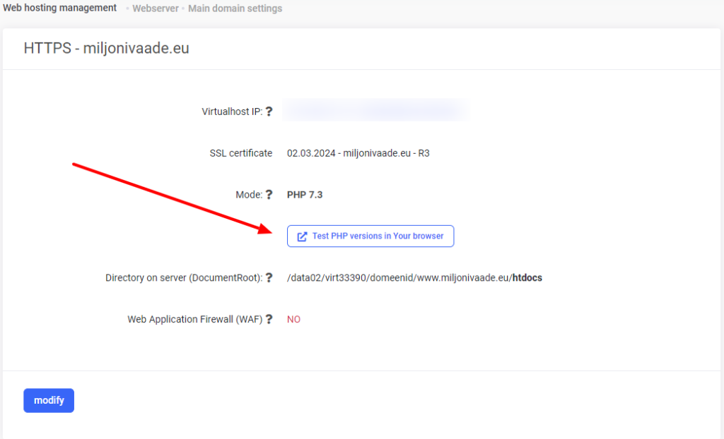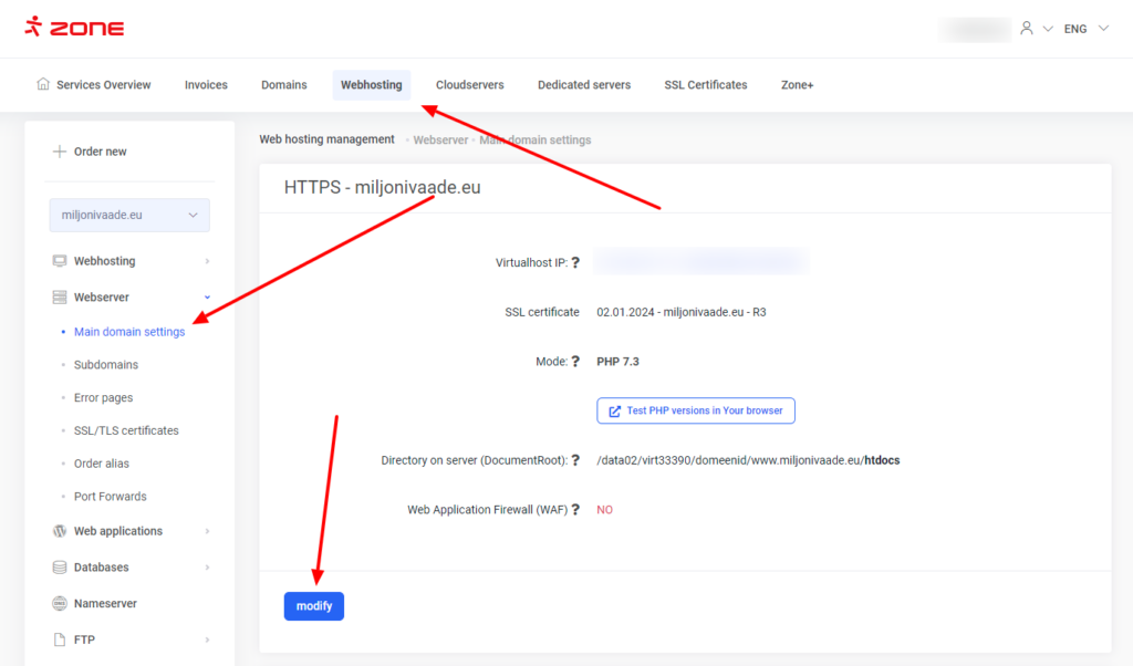 To change the PHP version on your server, open Webhosting  from the top menu, and then, under the Webserver section on the left menu, select Main domain settings. On the opened page, find the modify button.