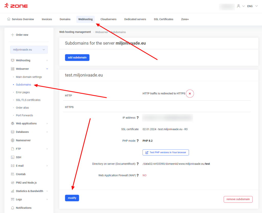 To change the PHP version for a subdomain, go to Webhosting, then select Webserver from the left menu. Then click on Subdomains. On the opened page, find the subdomain for which you want to change the PHP version and press the modify button.