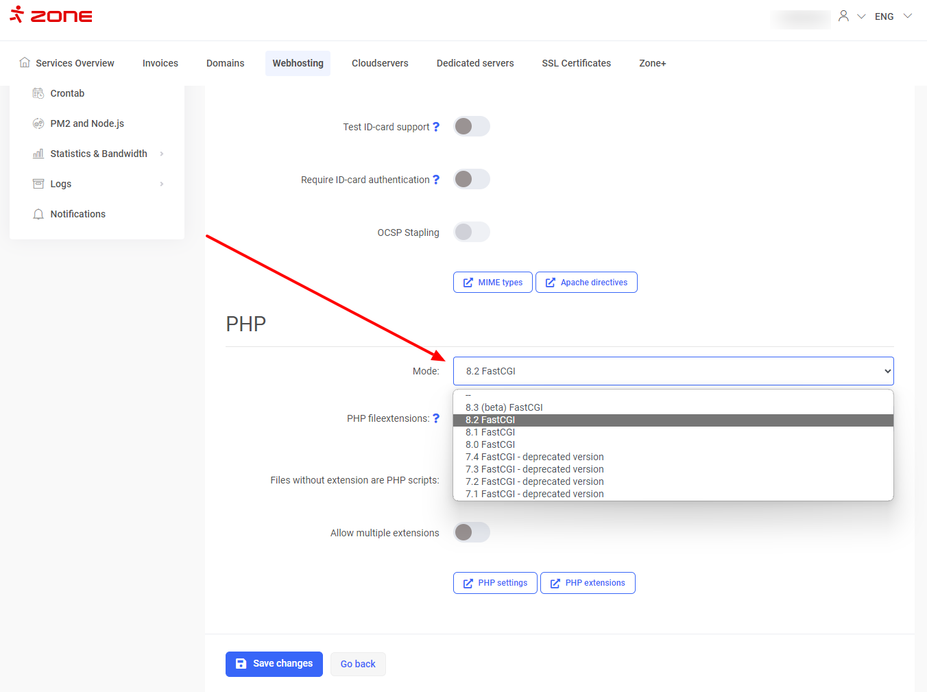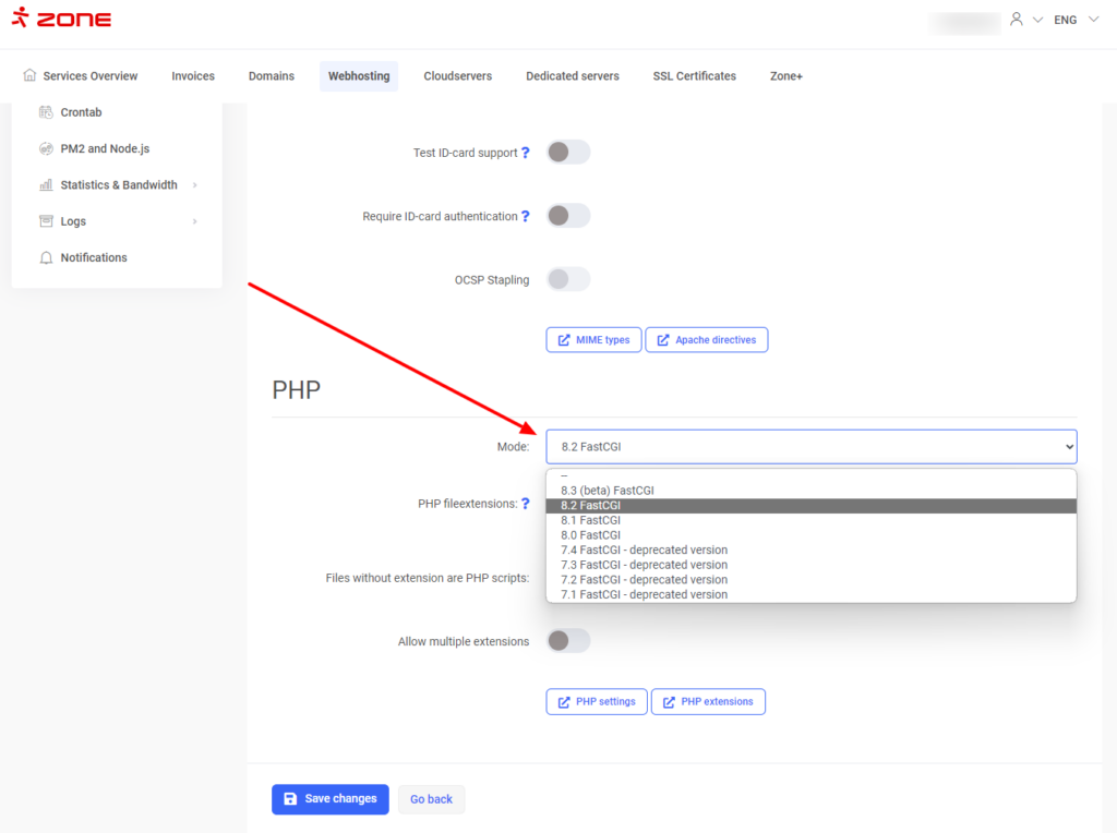 At the bottom of the page, there is a dropdown menu where you can choose between different PHP versions. Select the desired version and save by pressing the Save changes button.