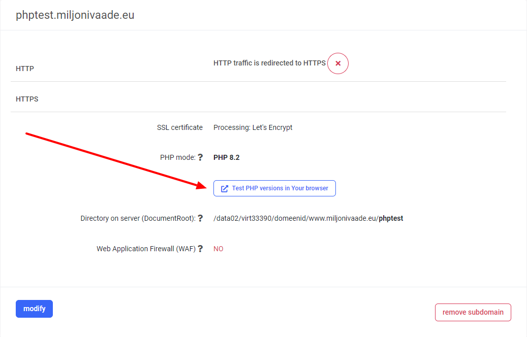 The functionality of the application with different PHP versions can be tested in your browser. Testing is possible both on the main domain and on various subdomains. To do this, locate the button Test PHP versions in Your browser. You can find it on the main domain settings page as well as on the subdomains page.