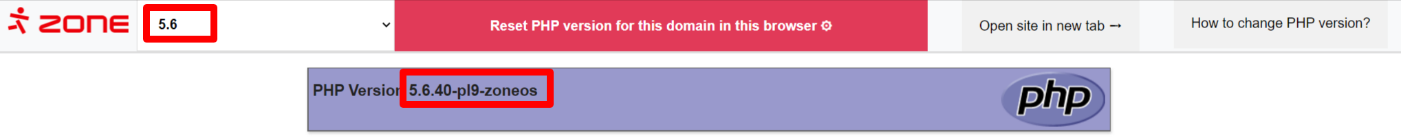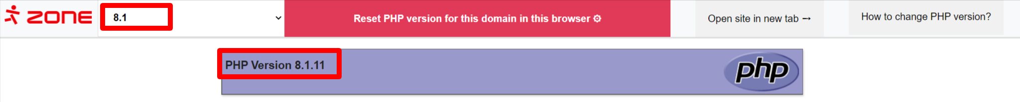 A test page will open with a selection of PHP versions in the header. Choosing between them will show you the result with different PHP versions. For example: