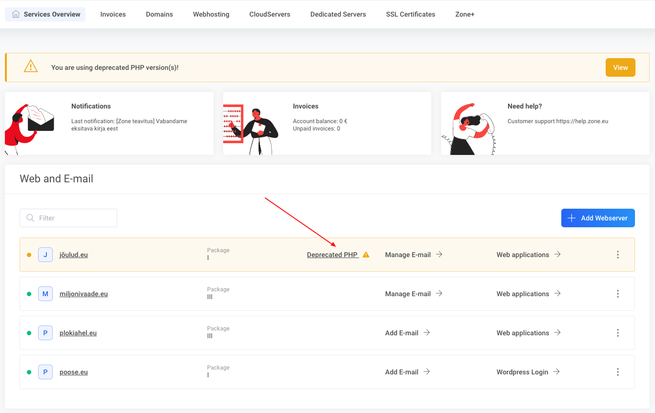 If some of your virtual servers are using deprecated versions of PHP, a warning will appear on the My Zone Overview page.