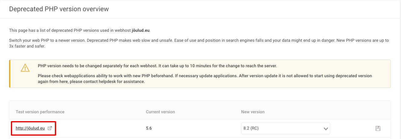As PHP version changes can cause error messages to appear on the website and version changes can take up to 3 minutes, it is recommended to test the functionality of the website before making a change.