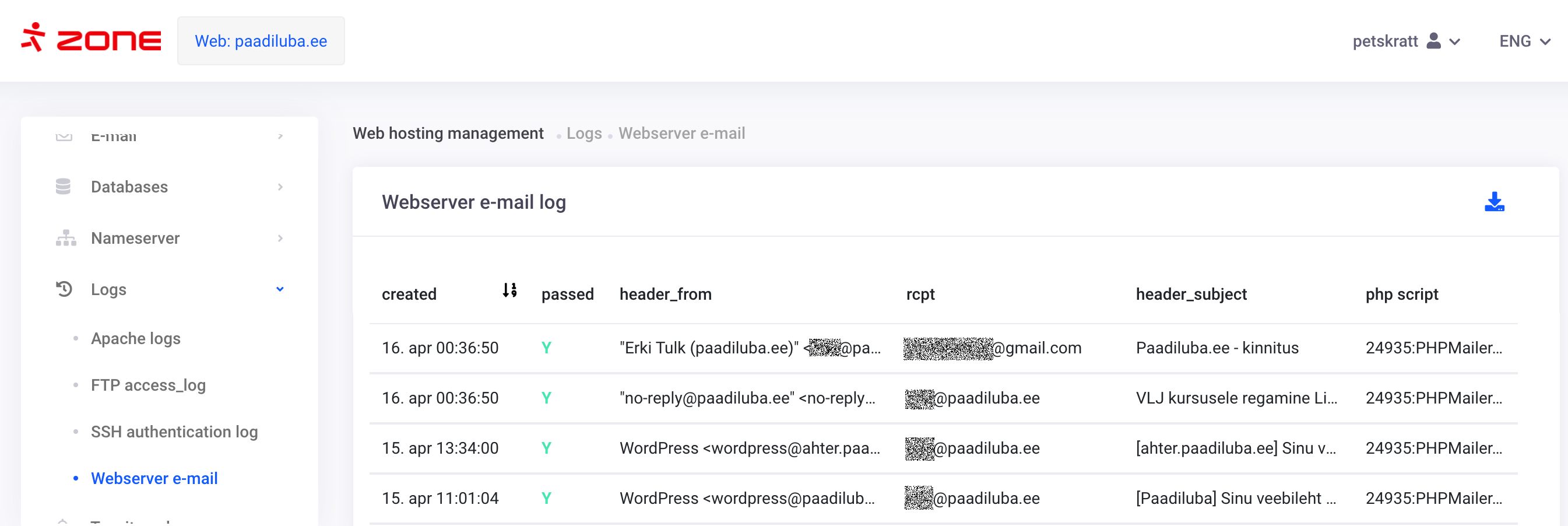 passed– did e-mail pass the filter? (N means blocking due to exceeding limits or triggering spam detection)header_from– sender’s address (envelope_from is available in .json)rcpt– actual recipient (includes bcc: addresses; header_to is available .json)php script– script that sent the email (available only if PHP mail() was used – missing if a library used another method)
