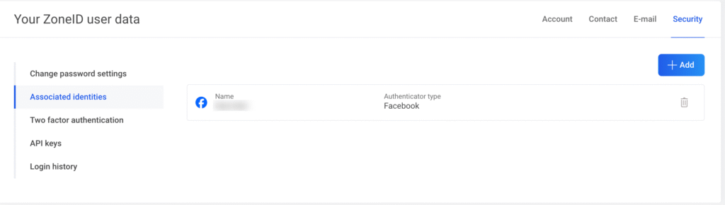 In order to connect Facebook with your ZoneID account, first log in to My Zone control panel  with your username and password, then open Settings and Security under your username. Next select Associated identities.