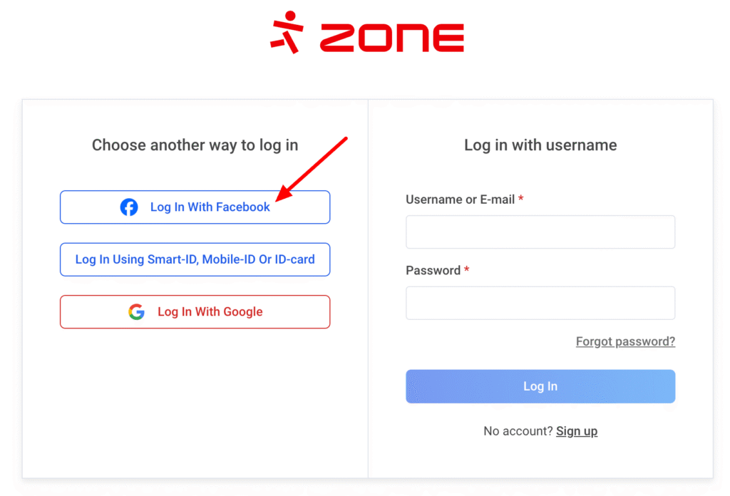 To log in with Facebook, select My Zone at the top right of the Zone homepage. A login page will open and click Log in with Facebook.