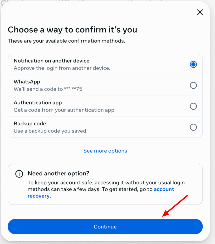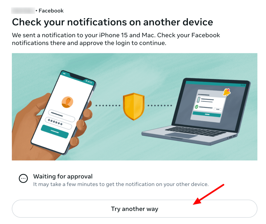 If you have 2FA activated on your Facebook account, you will need to additionally confirm your login on another device or choose another verification method.