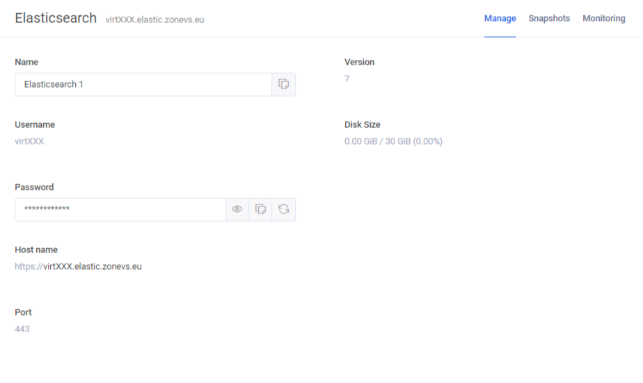 • Elasticsearch Server hostname: https://virtXXX.elastic.zonevs.eu