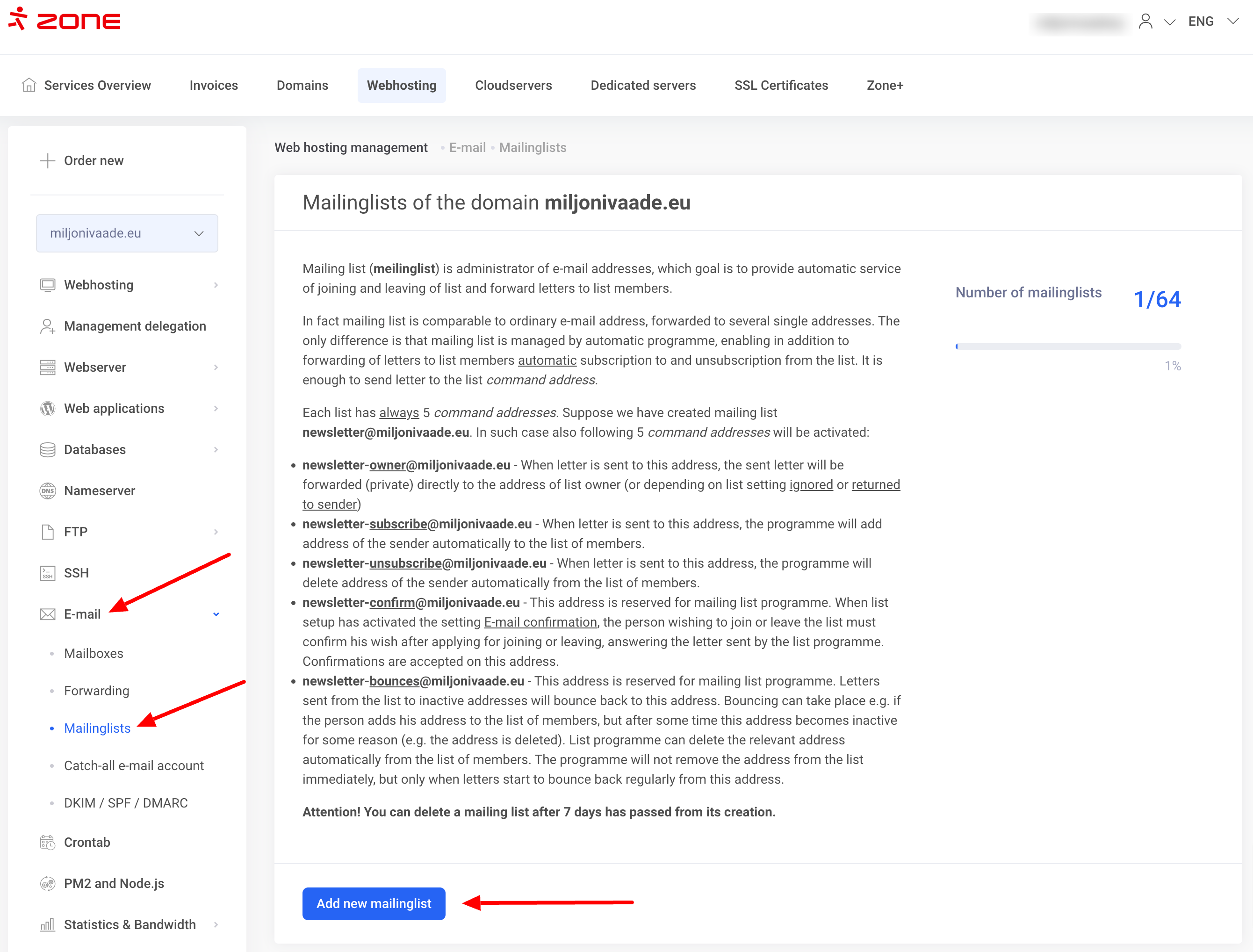 1. To set up a mailing list, log in to Мy Zone and on the service overview page, click on the appropriate hosting. Then in the left menu E-mail , Mailinglist  and Add new mailinglist.