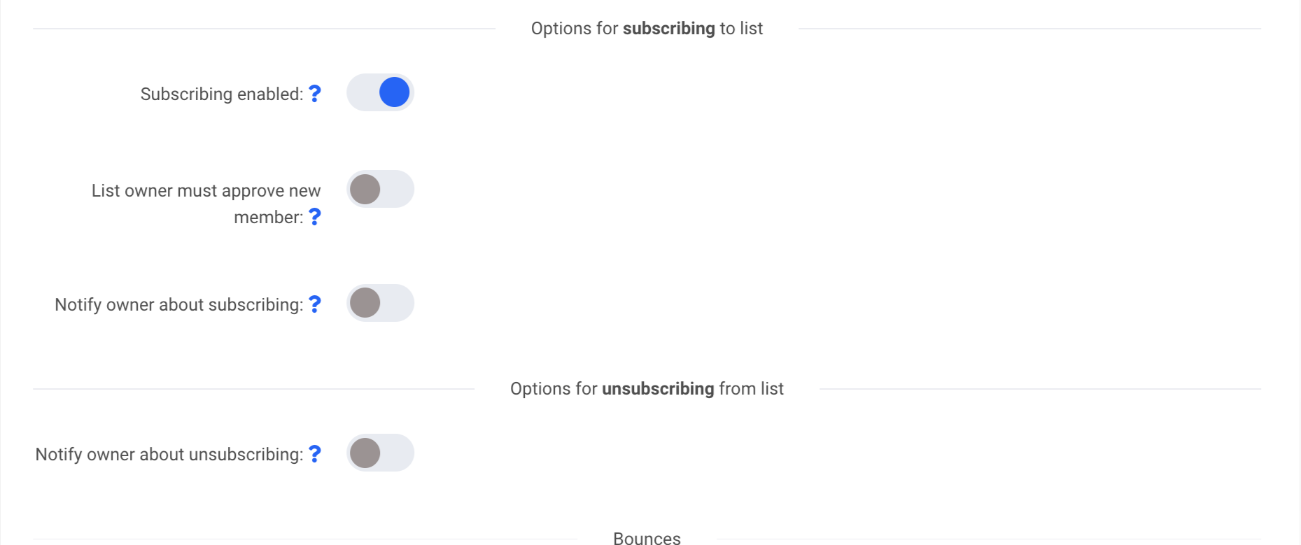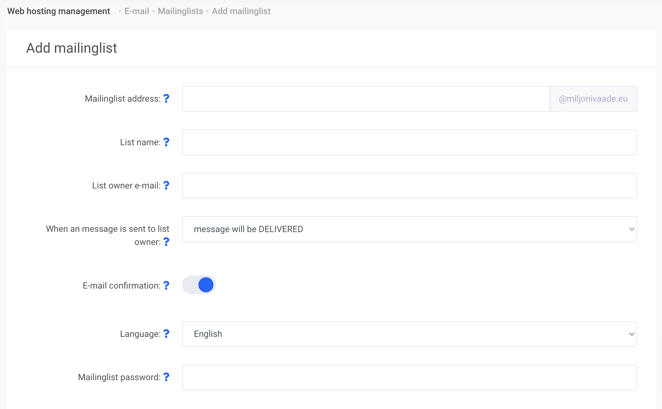 List owner email: E-mail address to which the mailing list program will send messages related to the mailing list. This address will not be automatically added to the list of members of the mailing list. When a message is sent to the list owner: Each list has always 4 command addresses, one of which is newsletter-owner@domeen.eu (according to your domain name). Here you can configure, what action will be performed when the message is sent to the owner of the mailing list. Whether the message is delivered to the owner, rejected or ignored.