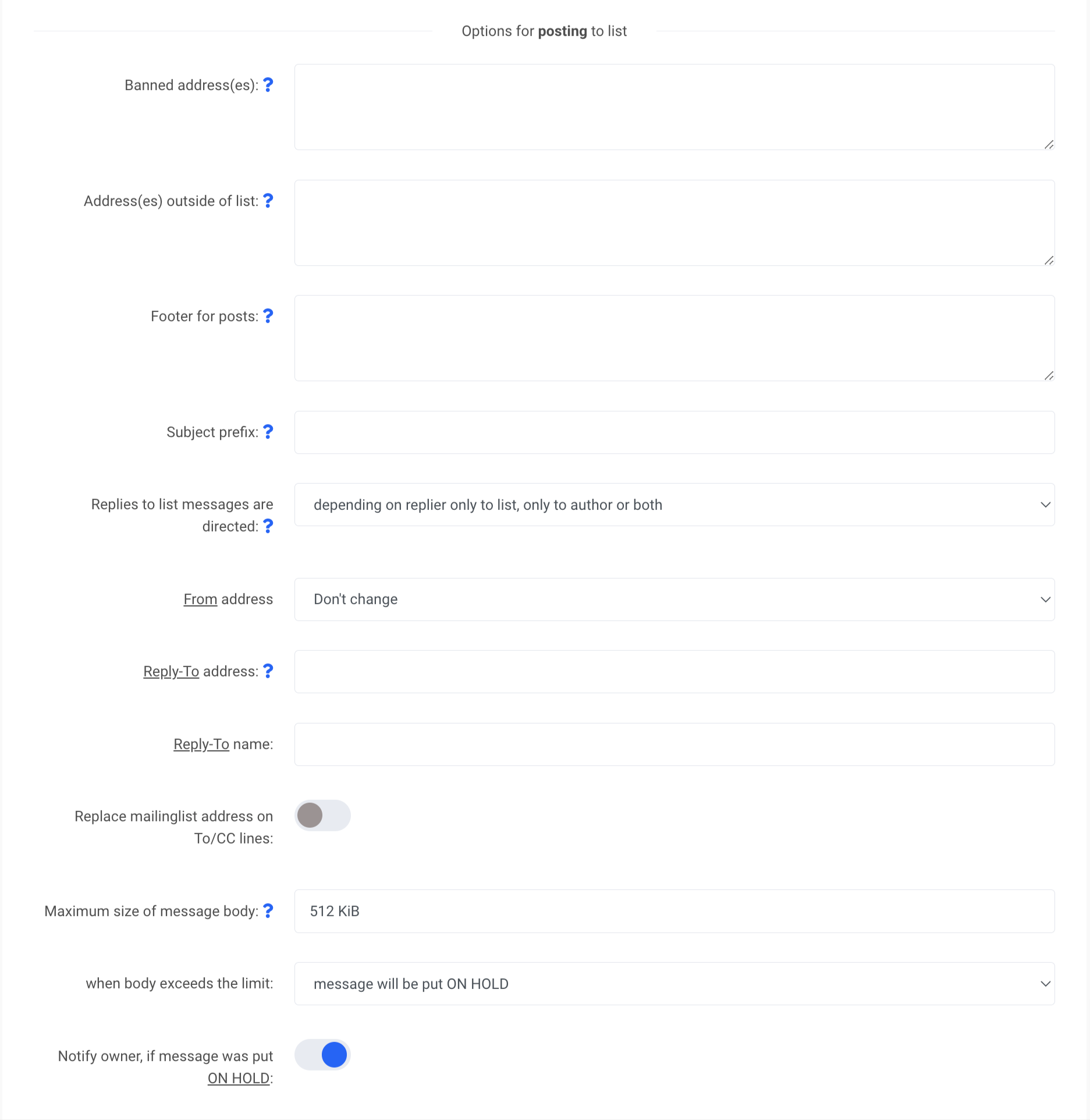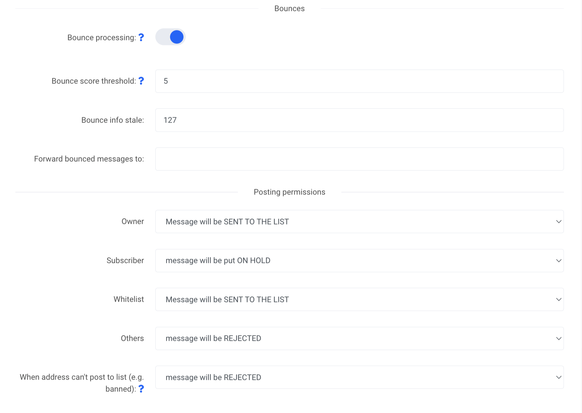 In the posting permissions section you can note how the mailing list programme acts when messages are sent to the list by different senders – whether messages are put on hold, discarded or rejected.