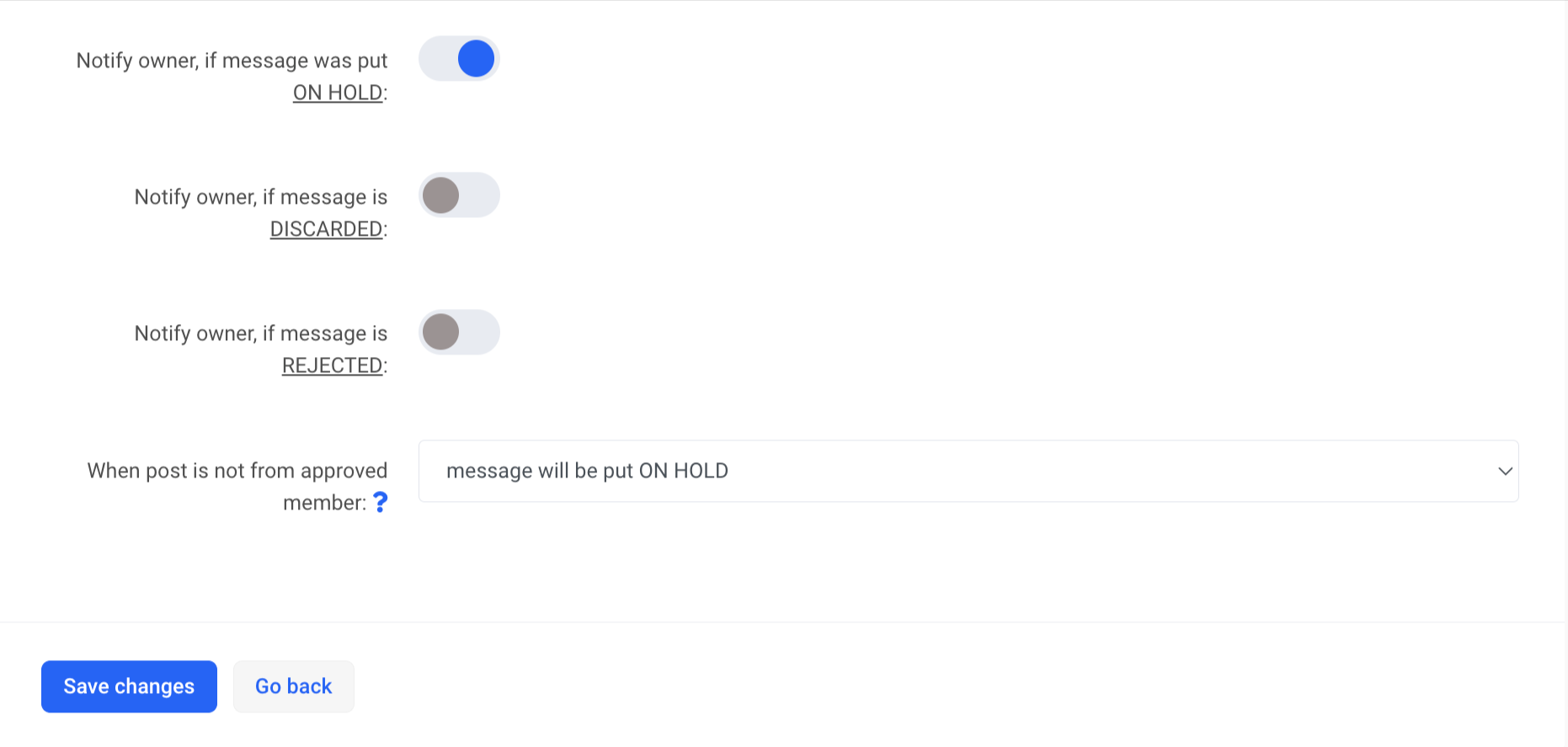 Notify owner, if the message was put ON HOLD, if the message is DISCARDED or if the message is REJECTED: the list’s owner can receive a notification, when message is put on hold, discarded or rejected.