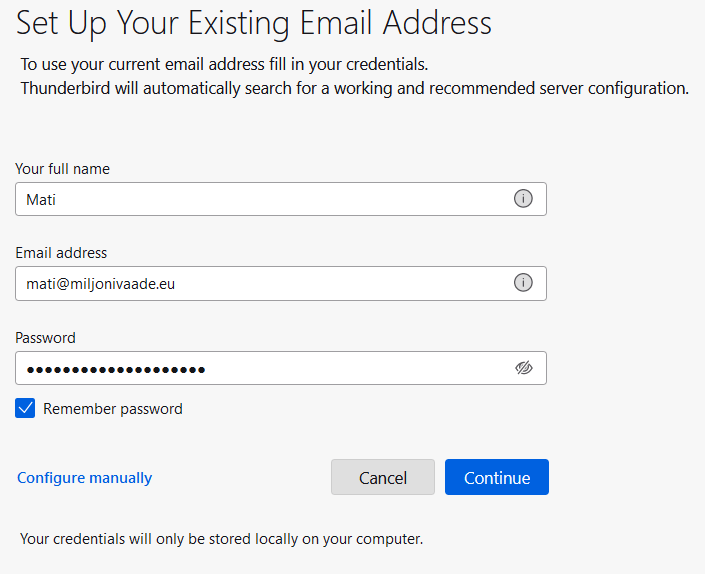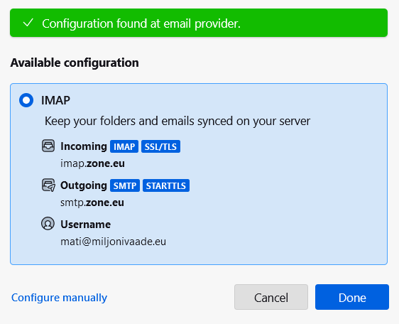 4. If Thunderbird was unable to detect the data automatically, in the last step of the automatic setup window, click on Manual confirugation option: