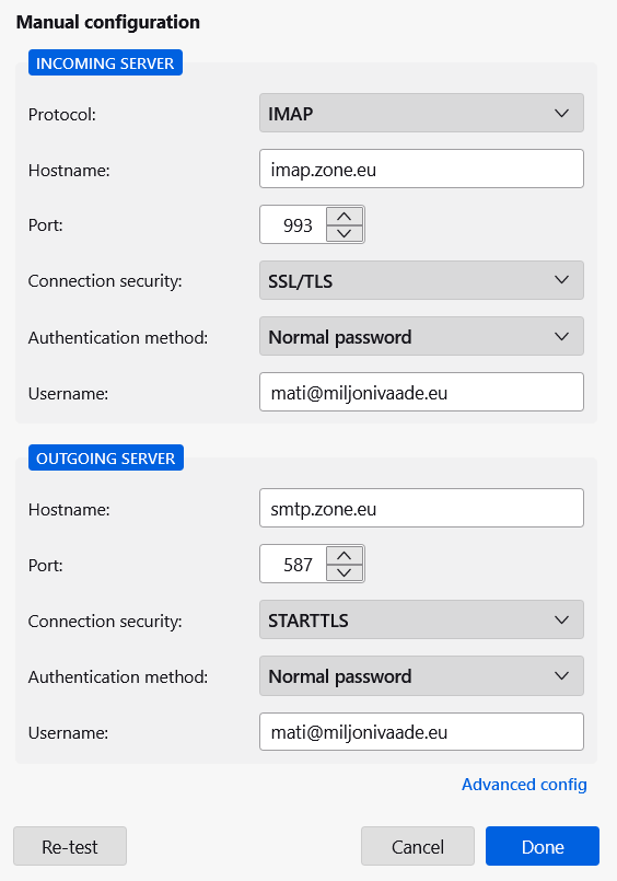 - Outgoing mail server i.e SMTP server: smtp.zone.eu port 465 SSL/TLS or 587 STARTTLS