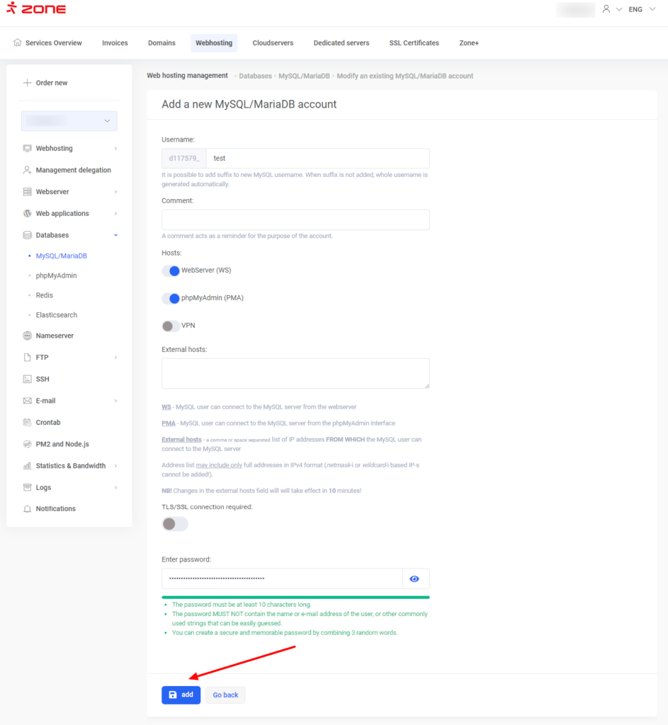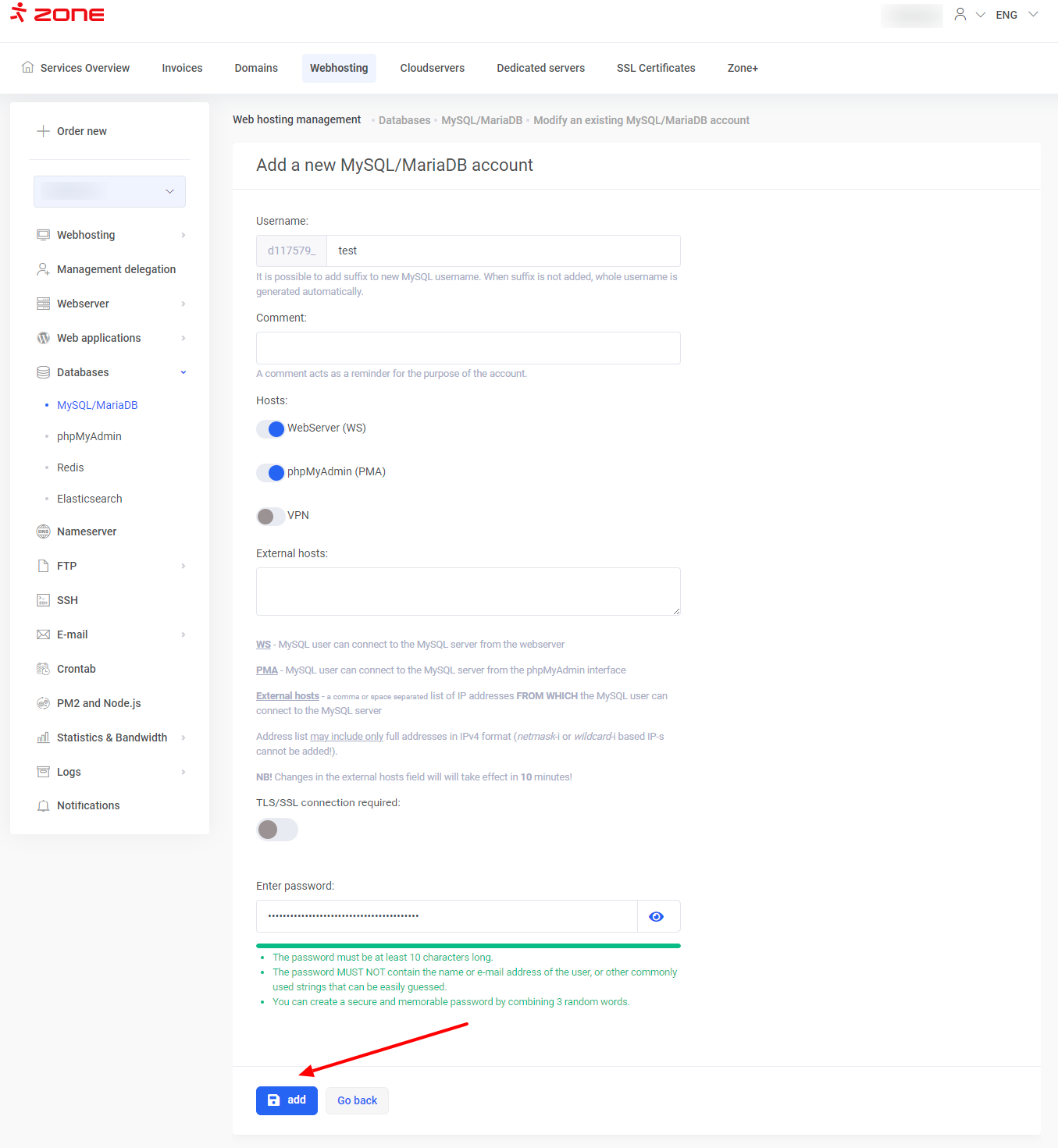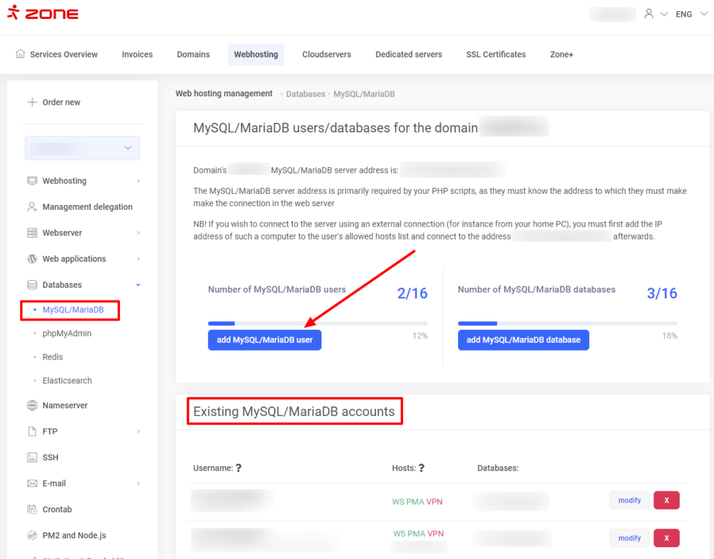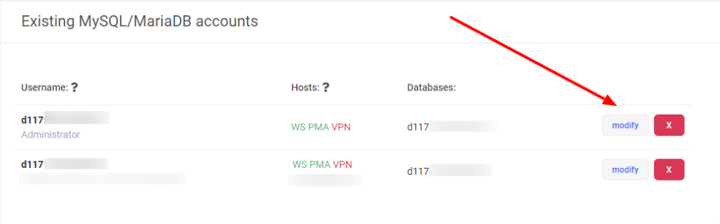If you don’t know the existing password for a database user, you can reset it. To do this, press modify in the Existing MySQL/MariaDB accounts section.