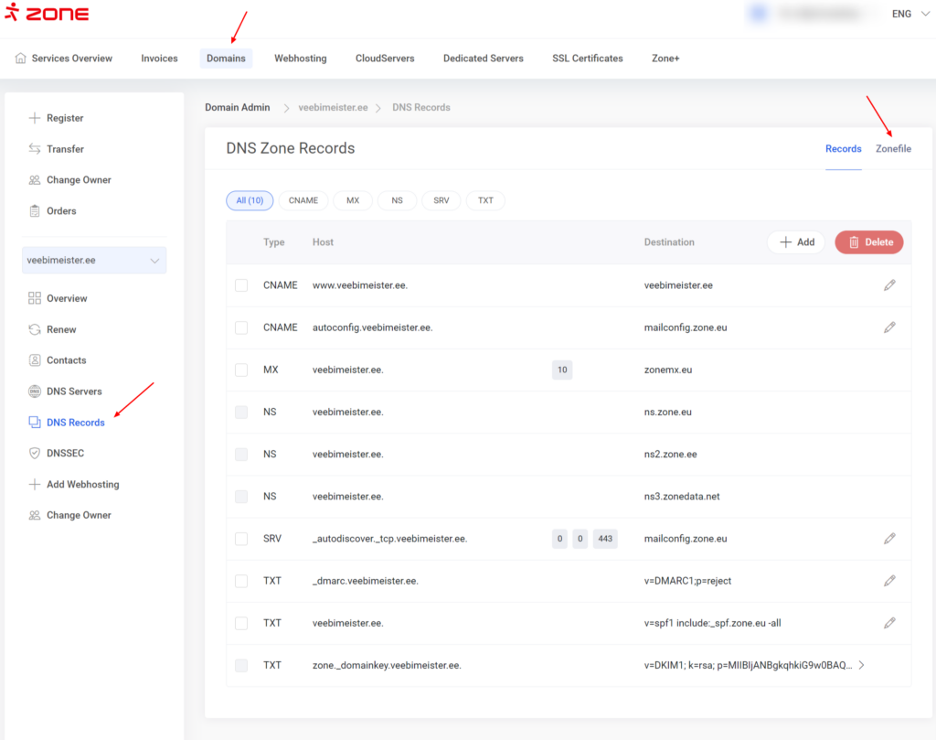 If you are using a web hosting service elsewhere, but the domain is in the Zone registry and uses Zone name servers, the DNS zone file can be found in the domain management under the DNS Records: