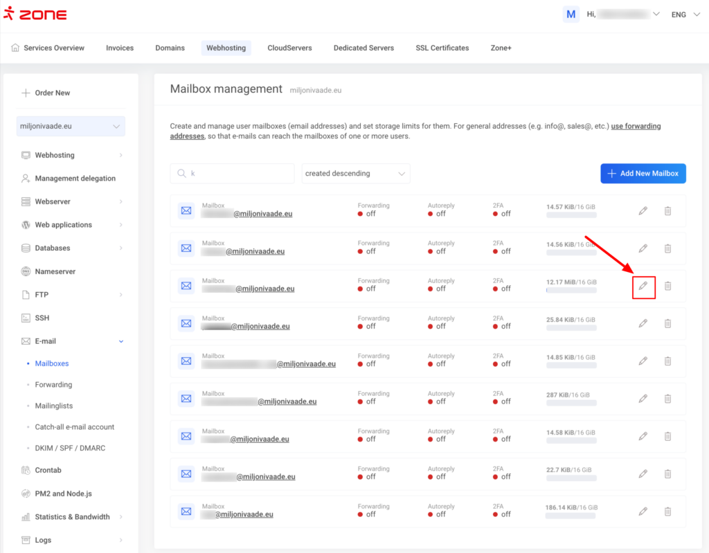 After logging in with your user account, choose Web hosting, E-mail and Mailboxes. Click the pencil icon next to the email account that needs to be increased.