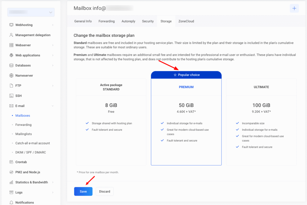 Premium and Ultimate mailboxes require an additional small fee and are intended for the professional e-mail user or enthusiast. These plans have individual storage, that is not affected by the hosting plan, and does not contribute to the hosting plan’s cumulative storage.