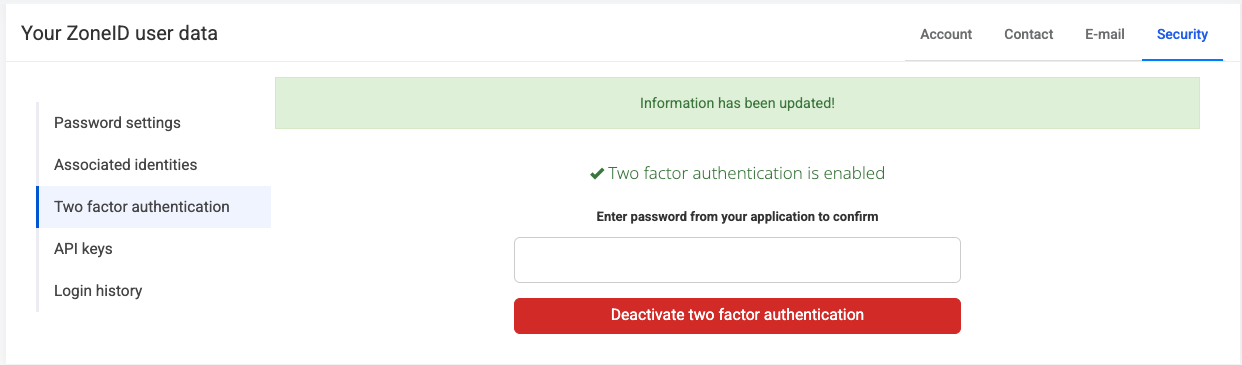 If the code was entered successfully, a notification stating Two factor authentication is enabled appears. It is also possible to deactivate 2FA from the same menu, if necessary.