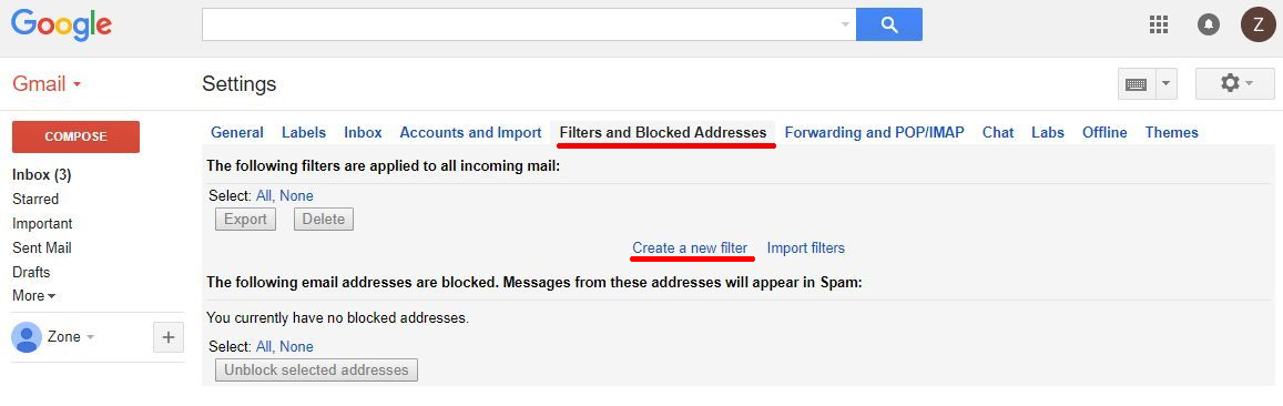 2. In settings select “Filters and Blocked Addresses”, then click “Create a new filter”.