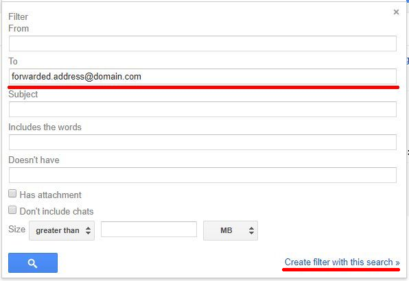 3. Enter your forwarded address on “To” field. If your address has been forwarded earlier, it is recommended to try searching before adding the filter. In this way it is possible to find earlier conversations. Click “Create filter with this search”.