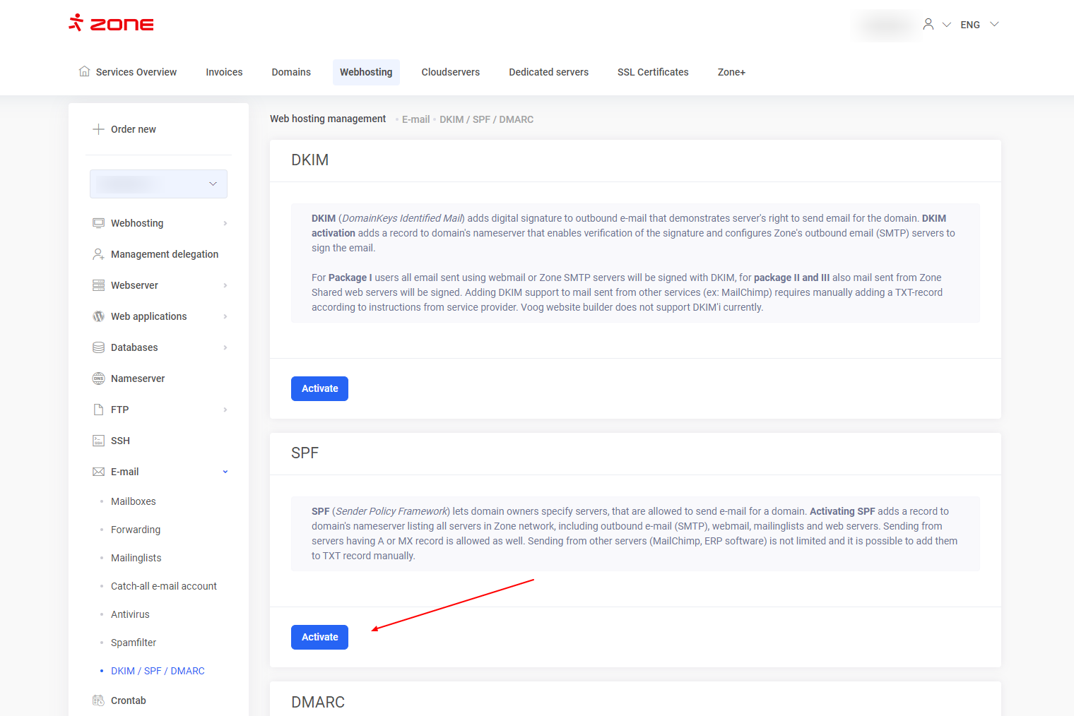 SPF can be activated by navigating to server management: “E-mail” -> “DKIM / SPF / DMARC”.