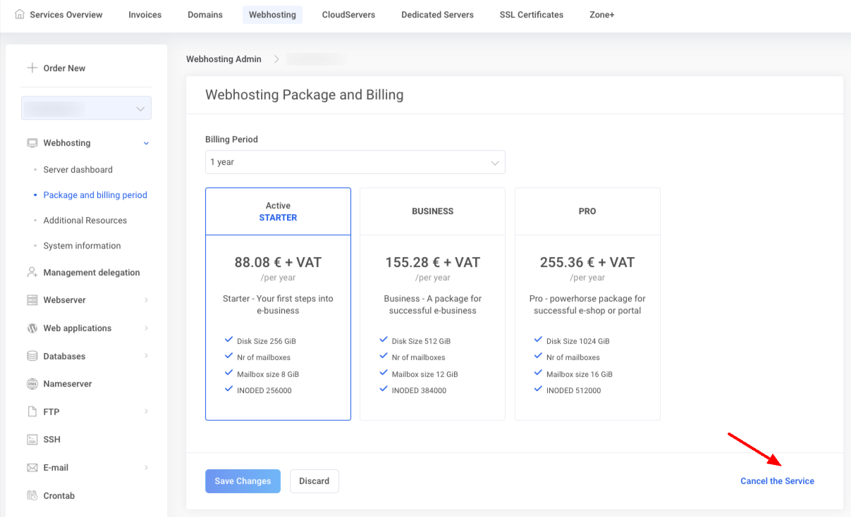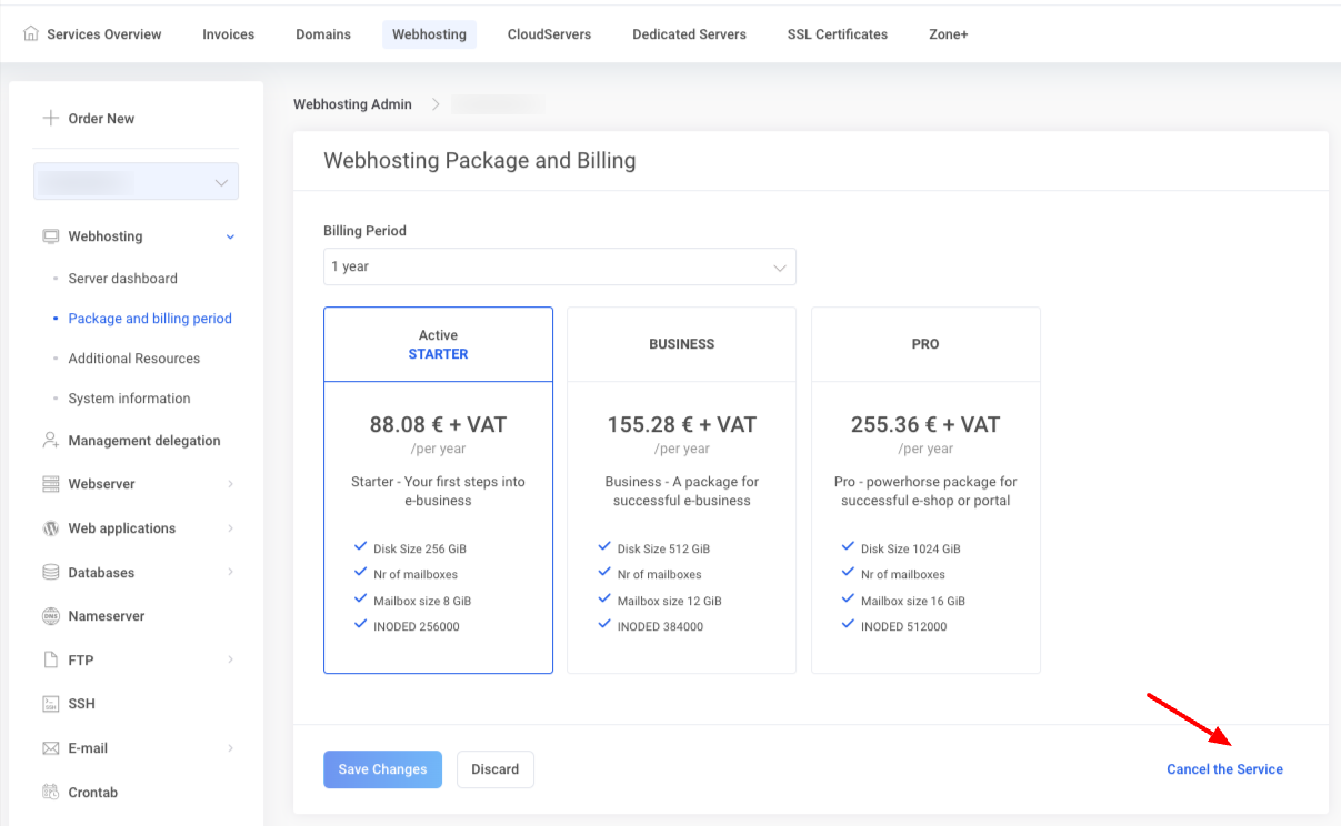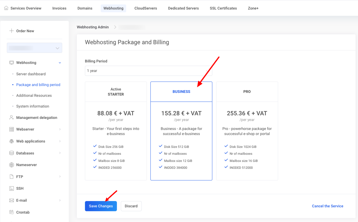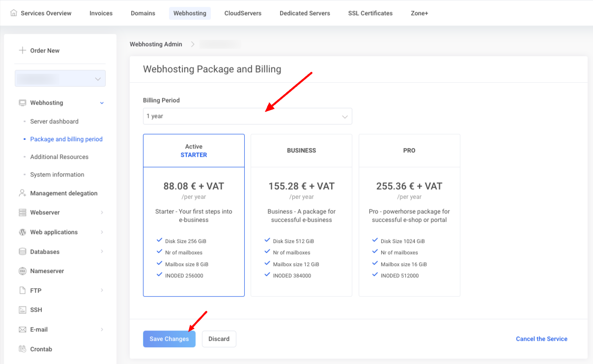My Zone in the web hosting management under Webhosting and Package and billing period. The change will take effect immediately, after which the prepaid period of the old package will be credited and the new package will be billed at the beginning of the next billing period.