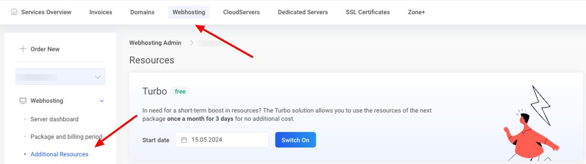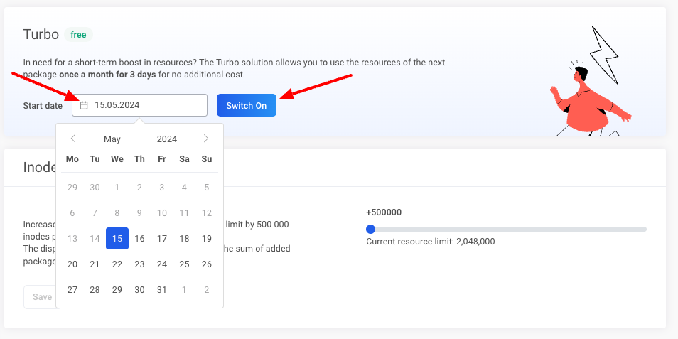 To enable the Turbo, first select the date when additional resources will be required, and then click Switch on.