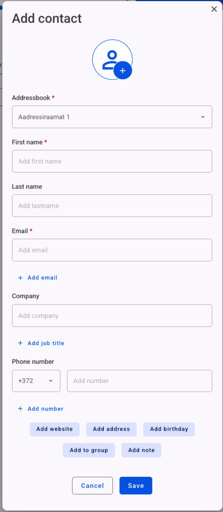 In the new window, select Addressbook, then enter the contact’s first and last name, and email address. If required, you can also enter the company name, job title, phone number, birthday, etc. Once the details have been entered, click Save and the contact will be saved in the contact list.