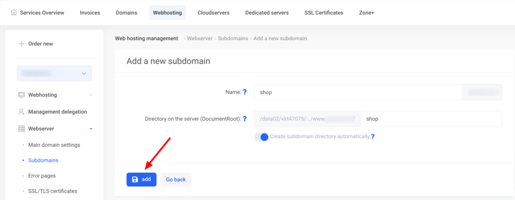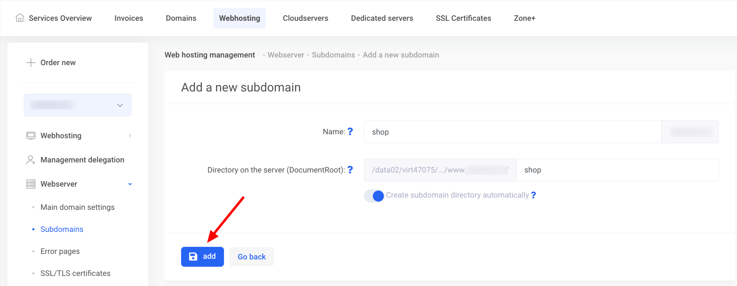 By default, the subdomain name directory is added automatically, but if you want to manually add the directory, then Create subdomain directory automatically must be deactivated.