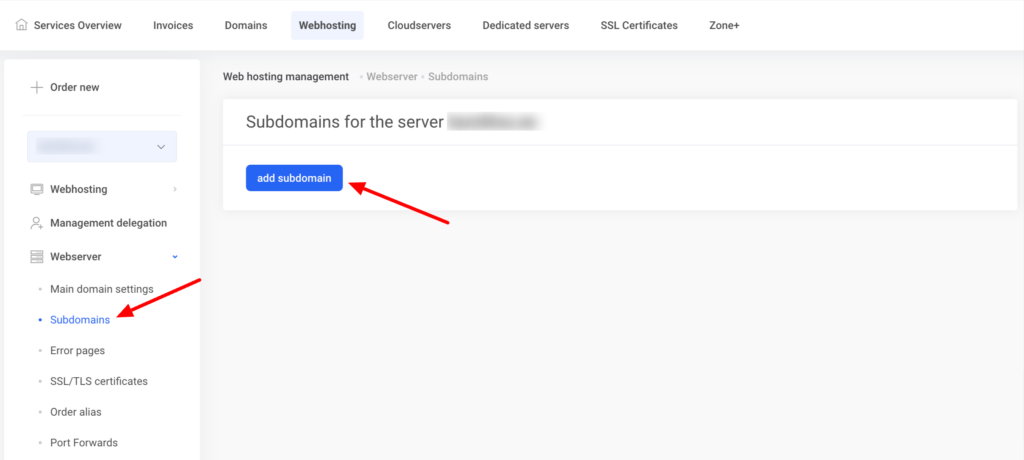 If the nameservers in the main domain are pointed elsewhere, i.e. using name servers from another provider, then an A record should be created for the subdomain at that provider. The IP address of the A-record can be found in the Webhosting menu on the left, by choosing Webhosting, System Information and IP Address