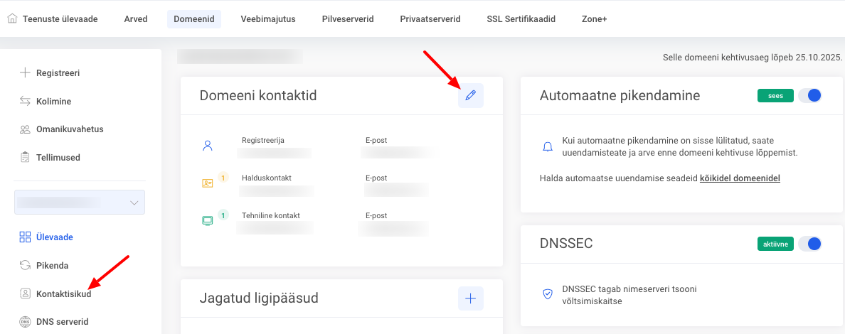 Domeeni andmeid saab muuta Minu Zone keskkonnas Domeenide halduses valides vastava domeeni ja klõpsates pliiatsi ikoonile jaotises Domeeni kontaktid.