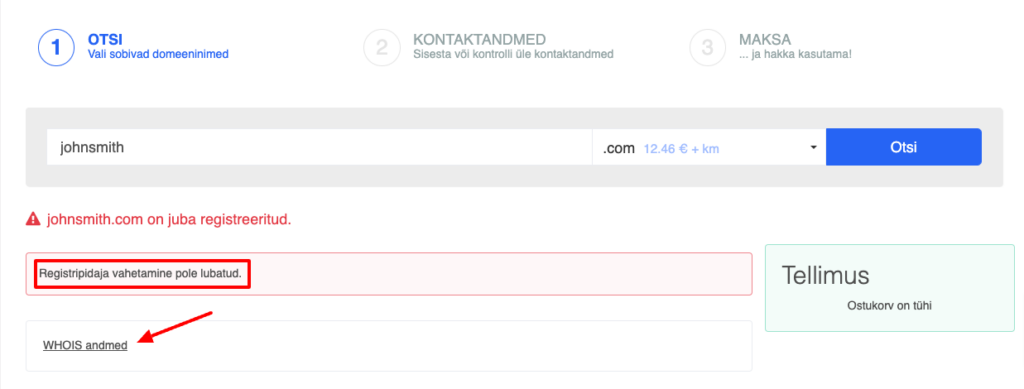 • Kui domeen kasutab privaatsusteenust (Privacy protection), siis soovitame kontrollida e-posti aadressi aktuaalsust või lülitada Privacy protection ajutiselt välja.