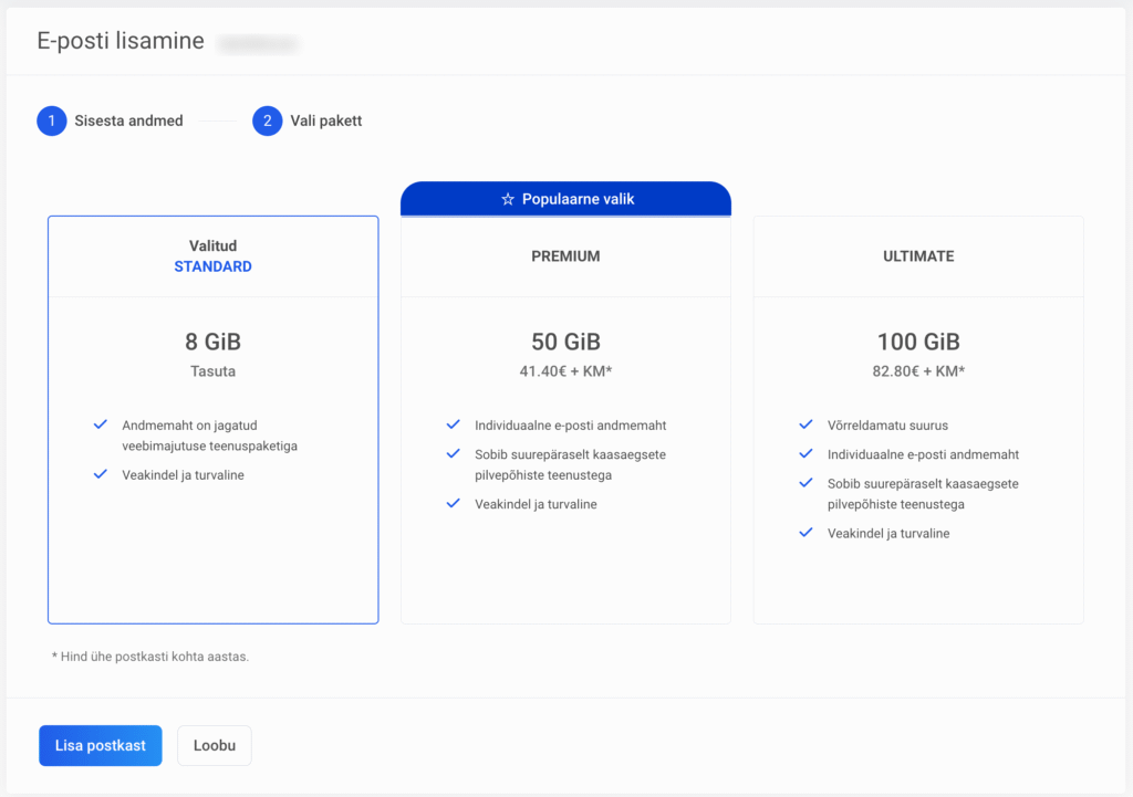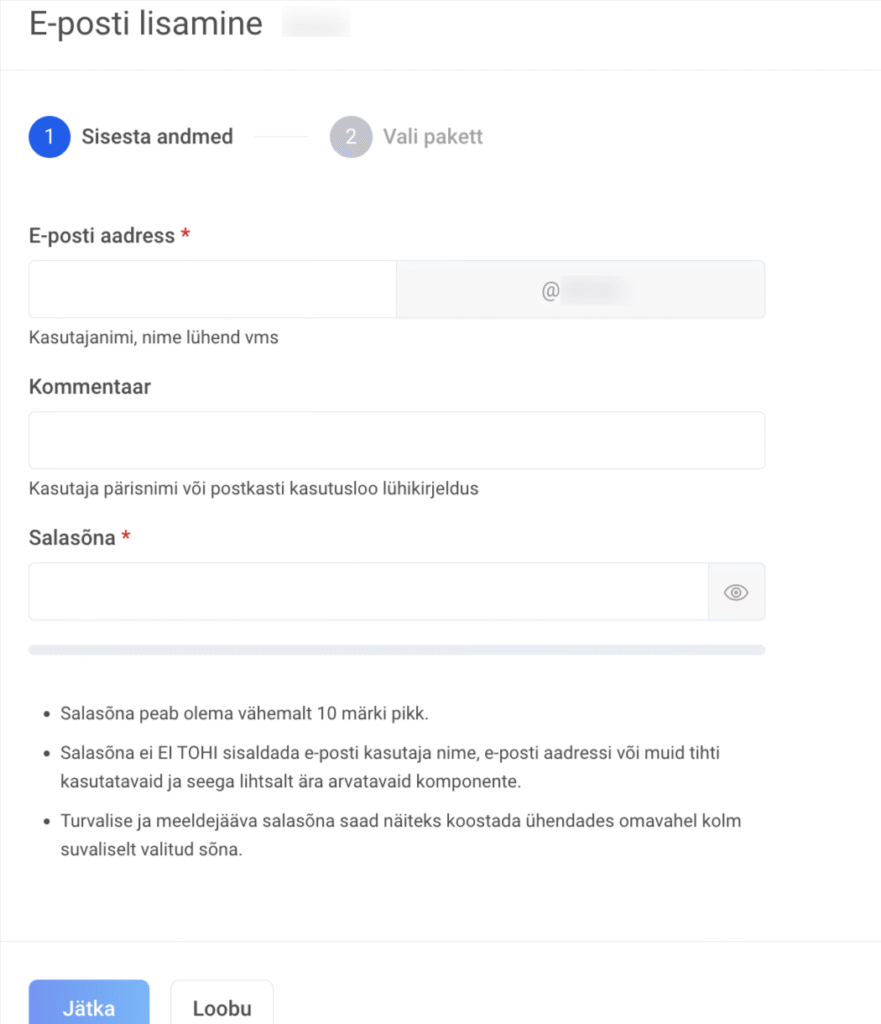 Uue postkasti lisamiseks on vaja täita tärniga lahtrid E-posti aadress ja Salasõna. Kommentaari lahter on valikuline – see on visuaalne abivahend postkastide eristamiseks puhkudel kui aadresse on serveris palju, seda infot mujal ei näidata.